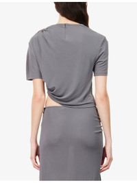 PRODUCT DETAILS - Christopher Esber jersey top - 100% viscose; embellishments 100% zinc alloy - Concealed zip fastening at back - Regular fit, cropped length, hardware at shoulder and side, ruched gathering at front, all-over stretch jersey - Dry clean - True to size - Model is 5ft 10in/1.78m and wears a size UK 8 - Lightweight, slight stretch Ref: R04563477