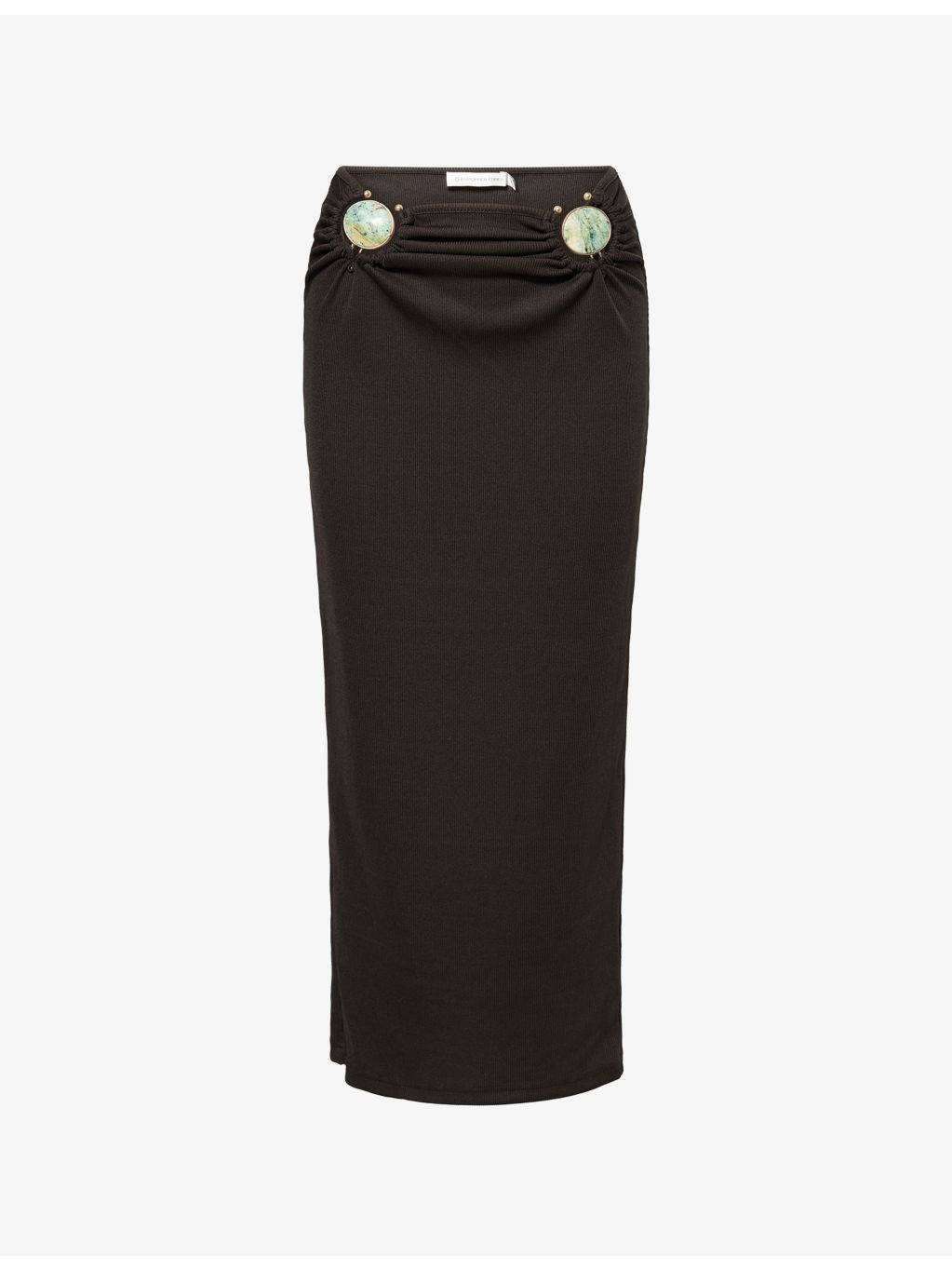 PRODUCT DETAILS - Christopher Esber stretch-woven midi skirt - 96% polyester, 4% elastane; embellishments 100% natural stone; hardware 100% brass - Slim fit, high-waist, elasticated waistband, underwired stones embellishment at front, ruched, all-over knitted and ribbed - Dry clean only - True to size - Size UK 8: length 36in / 92cm - Model is 5ft 10in/1.78m and wears a size UK 6 - Midweight, stretchy Ref: R04545321