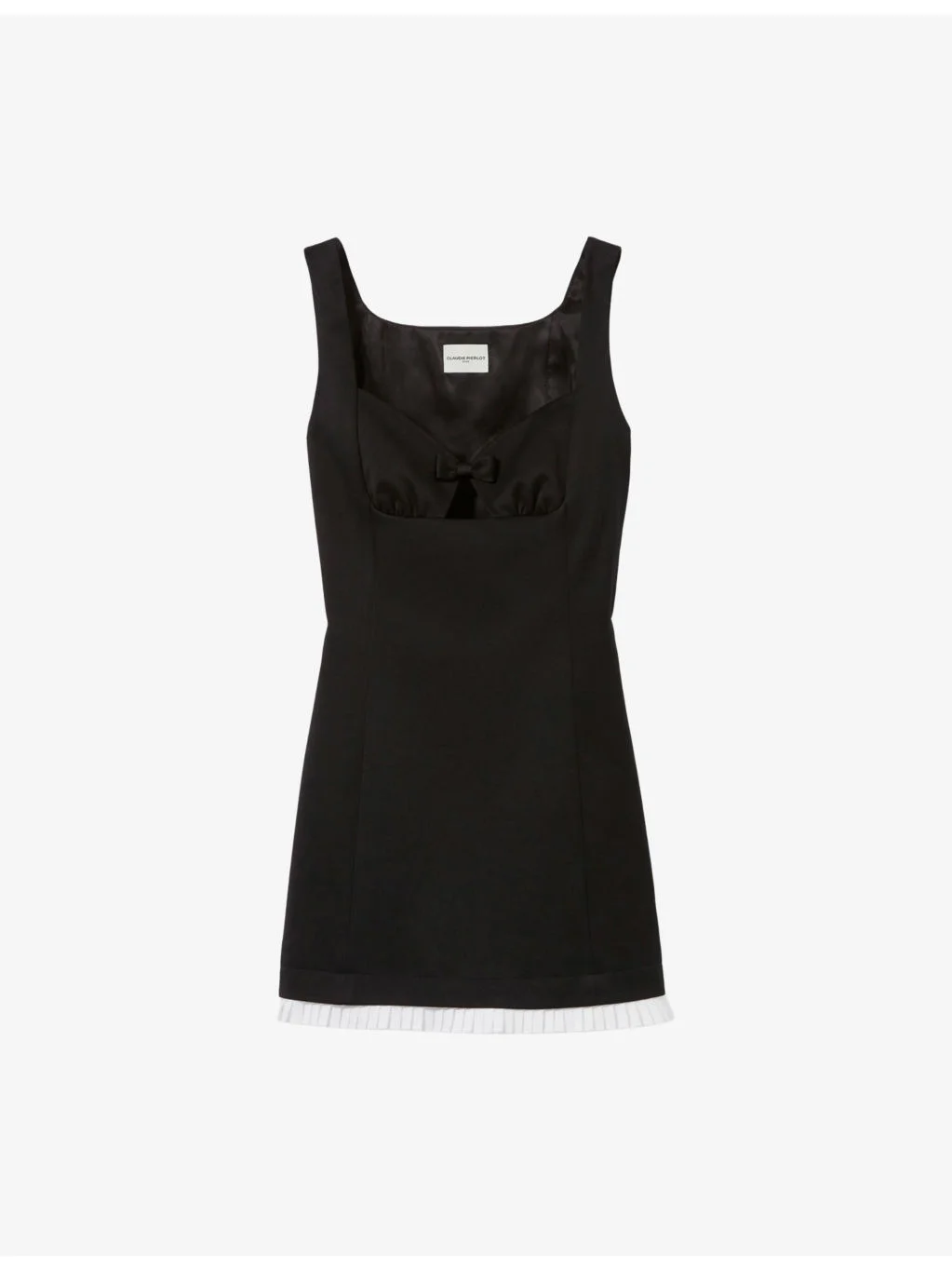 PRODUCT DETAILS - Claudie Pierlot woven mini dress - 100% polyester; lining 54% polyester, 46% viscose; contrast 100% cotton - Concealed zip fastening at side - Slim fit, sweetheart neck, wide shoulder straps, bow detail at neckline, cut-out at bust, flared skirt, contrasting pleated hem, mini length - Dry clean only - True to size - Lightweight, non-stretch Ref: R04508877