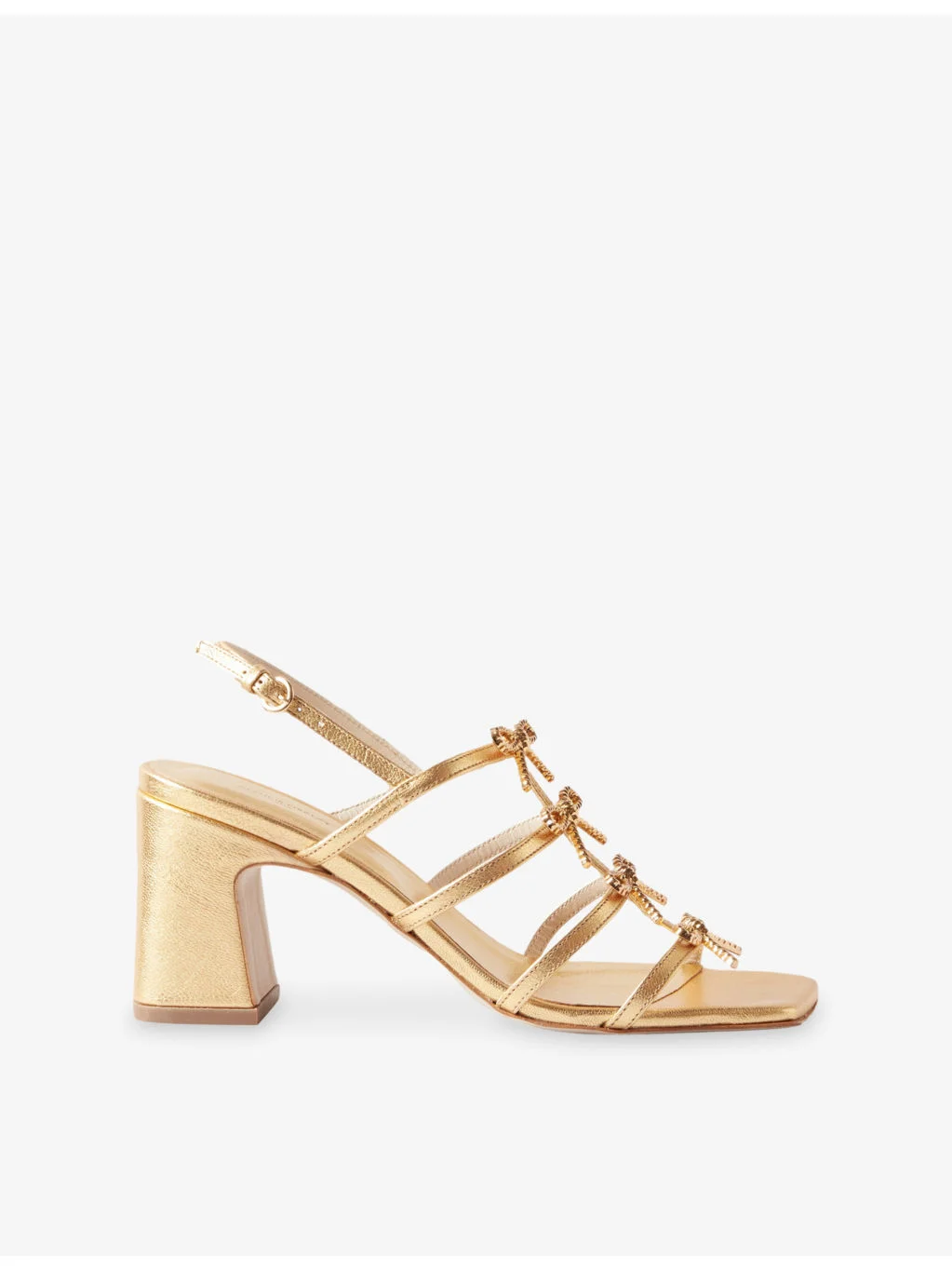 PRODUCT DETAILS - Claudie Pierlot leather heeled sandals - 100% leather - Ankle-buckle fastening - Open square toe, bow embellishments, high block heel, metallic finish - Heel height 2.9"" - Specialist leather clean - Upper: 100% leather - Lining: 100% leather - Sole: 100% synthetic Ref: R04599307