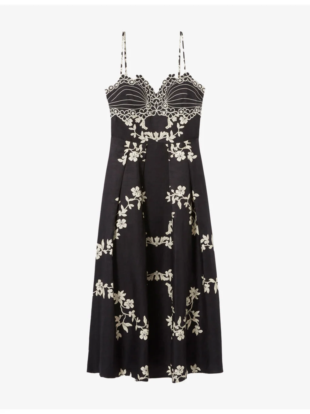 PRODUCT DETAILS - Claudie Pierlot woven maxi dress - 73% viscose, 27% linen - Zip fastening - Regular fit, V-neck, slim straps, fitted waist panel, floral embroidery to bodice, floral print to skirt - Dry clean - True to size - Lightweight, non-stretch Ref: R04599916