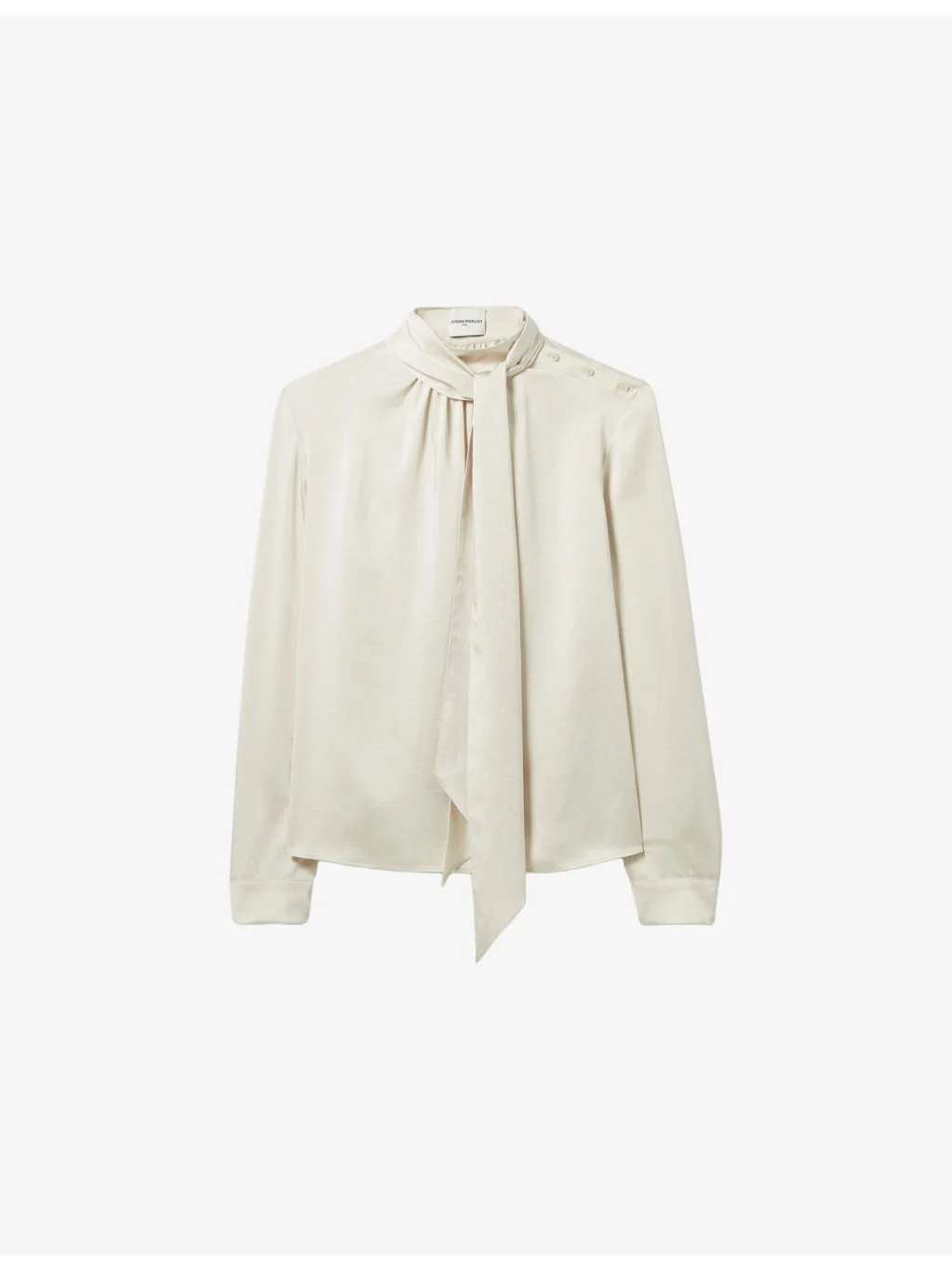 PRODUCT DETAILS - Claudie Pierlot woven blouse - 100% polyester - Exposed button fastening at the front - Relaxed fit, tie-neck collar, buttons at shoulder, long sleeves, buttoned cuffs - Machine wash at 30°C - True to size - Model is 5ft 9in/1.76m and wears a size UK 8 - Lightweight, non-stretch Ref: R04532175