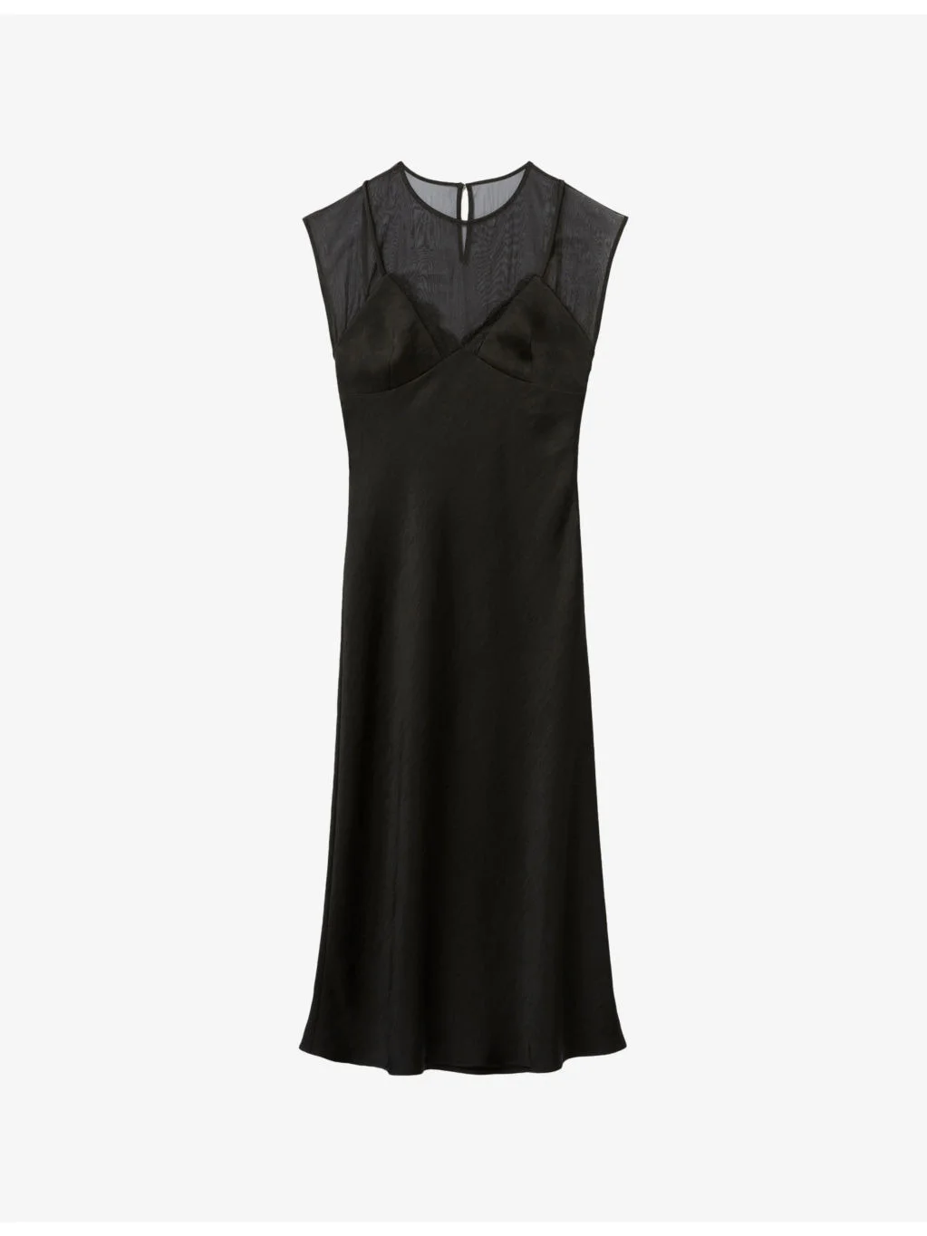 PRODUCT DETAILS - Claudie Pierlot woven dress - 100% polyester - Exposed button fastening at the back - Slim fit, round neck, sheer organza panel, lace-embroidered trim, flowy silhouette - Hand wash - True to size - Model is 5ft 9in/1.75m and wears a size UK 8 - Lightweight, non-stretch Ref: R04532171
