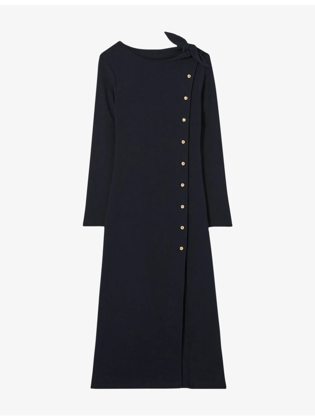 PRODUCT DETAILS - Claudie Pierlot stretch-knit dress - 92% cotton, 8% elastane - Exposed button fastening at front - Slim fit, round neck, long sleeves, gold-tone button embellishment at the side, split detail at the front - Hand wash - True to size - Midweight, slight-stretch Ref: R04532157