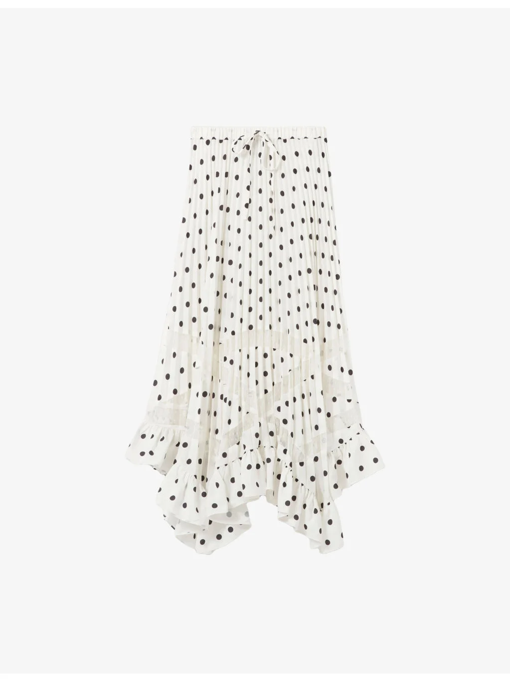 PRODUCT DETAILS - Claudie Pierlot woven maxi skirt - 100% polyester - Regular fit, elasticated waist, ruffle hem, pleated, lace trim, all-over polka-dot pattern - Machine wash mild - True to size - Lightweight, non-stretch Ref: R04599247