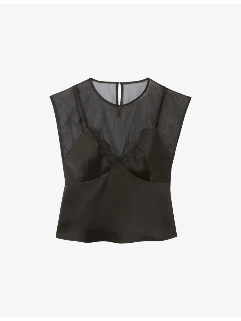 PRODUCT DETAILS - Claudie Pierlot satin top - 100% polyester - Concealed button fastenings at back - Regular fit, round neck, lace overlay detail at the neckline, organza-style fabric panel across the upper bust, sleeveless, fluid hem - Dry clean - True to size - Lightweight, non-stretch Ref: R04532183