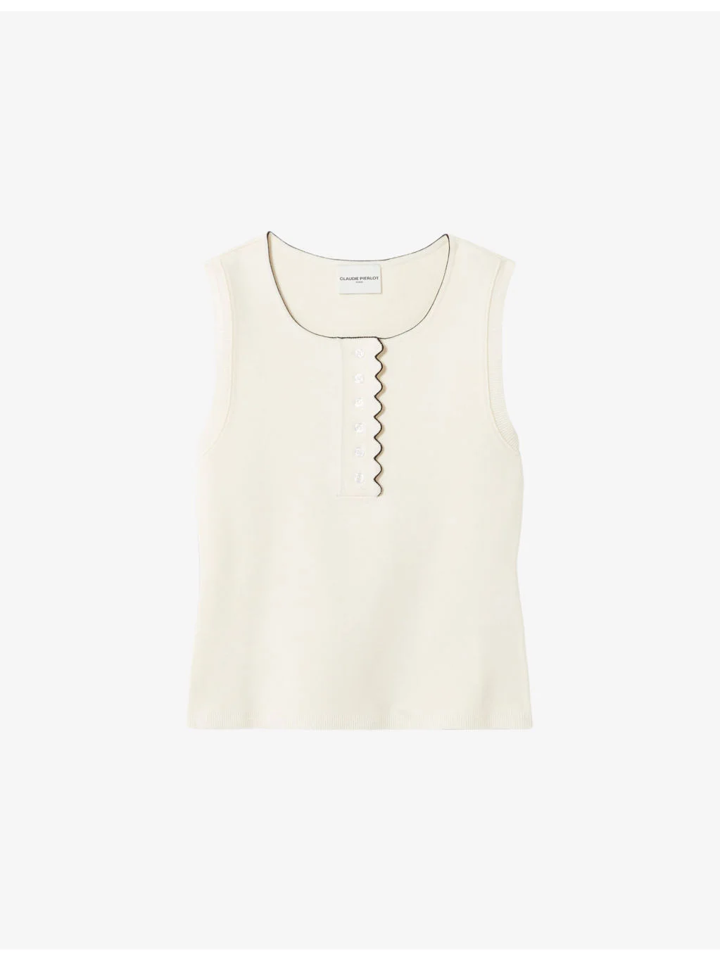 PRODUCT DETAILS - Claudie PIerlot knitted top - 85% viscose, 15% polyester - Exposed button fastening at front - Slim fit, round neck, button-down detail with scalloped trim, sleeveless - Hand wash - True to size - Midweight, slight stretch Ref: R04599921