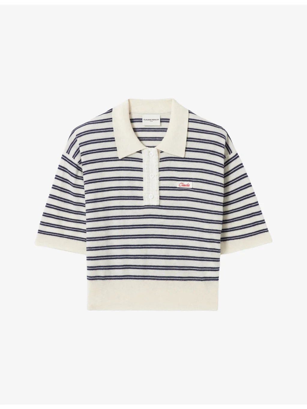 PRODUCT DETAILS - Claudie Pierlot wool polo - 100% wool - Exposed button fastening at front - Relaxed fit, collar with buttons, logo embroiery at the chest, short sleeves, stripe pattern - Hand wash - True to size - Midweight, non-stretch Ref: R04599244