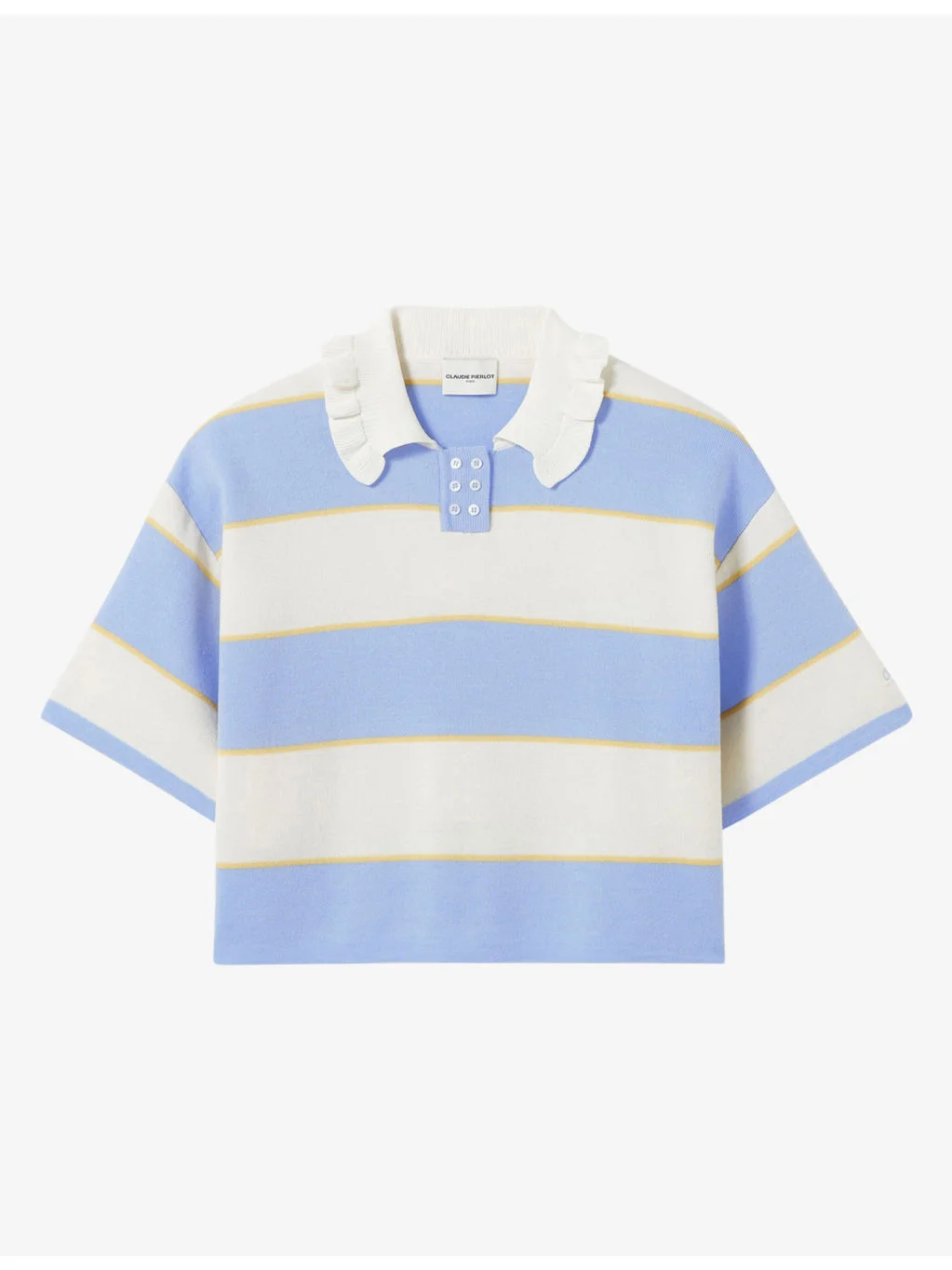 PRODUCT DETAILS - Claudie Pierlot knitted polo - 42% acrylic, 42% wool, 16% polyamide - Exposed button fastening at front - Relaxed fit, collar with buttons, short sleeves, stripe pattern - Hand wash - True to size - Midweight, non-stretch Ref: R04599223