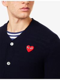 PRODUCT DETAILS - Comme des Garcons PLAY wool cardigan - 100% wool - Exposed button fastenings at front - Relaxed fit, V-neck, long sleeves, embroidered logo at front, mother-of-pearl buttons, ribbed trims, knitted - Dry clean - Made in Japan - Model is 6ft 2in/1.88m and wears a size medium - Lightweight, stretchy Ref: R04553096