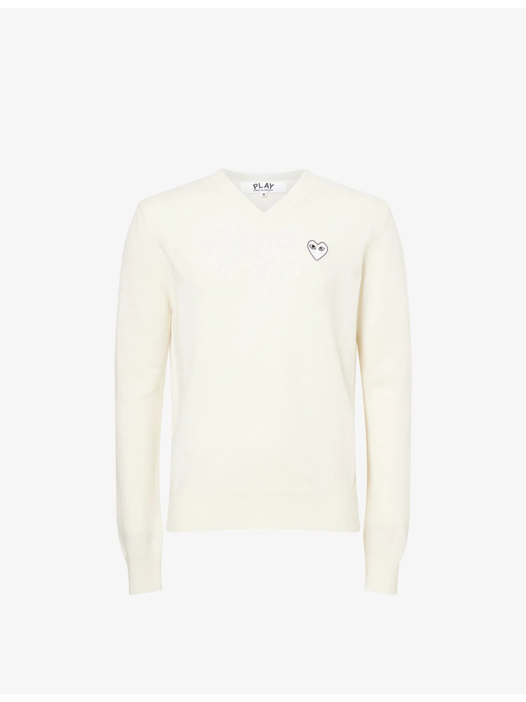 PRODUCT DETAILS - Comme des Garcons PLAY wool jumper - 100% wool - Pulls on - Regular fit, V-neck, long sleeves, heart embroidery at chest, ribbed trims - Dry clean - Model is 6ft 2in/1.88m and wears a size medium - Midweight, slight stretch Ref: R04563593