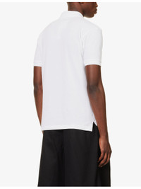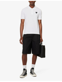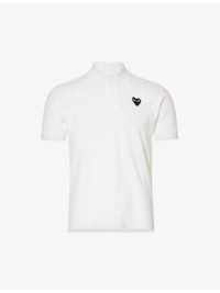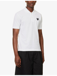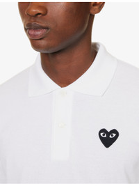 PRODUCT DETAILS - Comme des Garcons PLAY cotton-pique polo shirt - 100% cotton - Exposed button fastenings at front - Polo collar - Regular fit, short sleeves, pearlescent buttons, brand applique at chest, ribbed trims - Machine wash cold - Made in Japan - Model is 6ft 2in/1.88m and wears a size medium - Lightweight, slight stretch Ref: R04182759