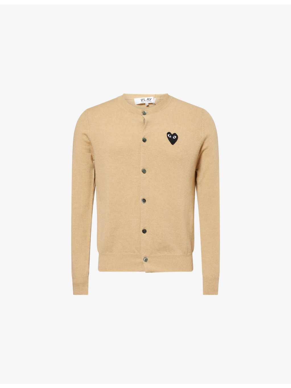 PRODUCT DETAILS - Comme des Garcons PLAY wool cardigan - 100% wool - Exposed button fastening at front - Regular fit, crewneck, long sleeves, medium knit, embroidered logo patch at chest, ribbed trims - Dry clean only - Made in Japan - Model is 6ft 2in/1.88m and wears a size medium - Lightweight, slight stretch Ref: R04470572