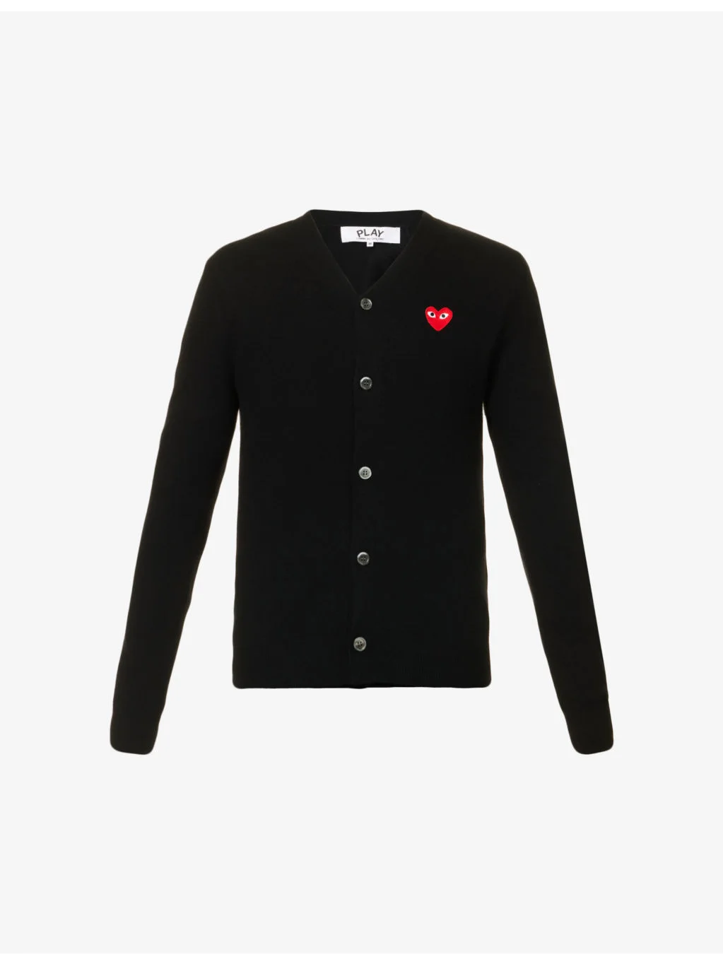 PRODUCT DETAILS - Comme des Garçons PLAY wool-knit cardigan - 100% wool - Exposed button fastenings at front - Regular fit, V-neck, long sleeves, medium knit, brand appliqué at chest, ribbed trims - Specialist dry clean only - Made in Japan - Model is 6 ft 2 in/1.88 m and wears a size medium - Lightweight, slight stretch