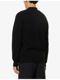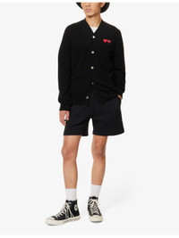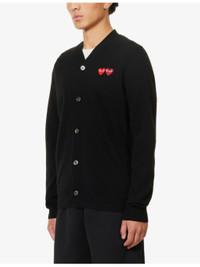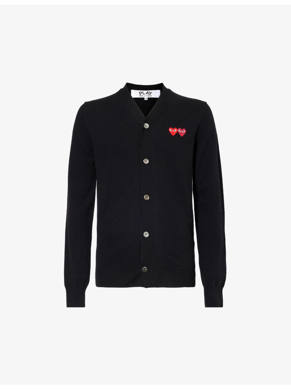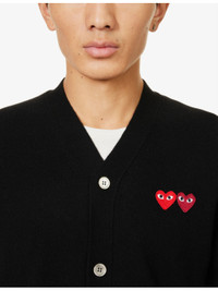 PRODUCT DETAILS - Comme des Garcons PLAY wool-knit cardigan - 100% wool - Button fastenings at front - Regular fit, V-neck, long sleeves, branded at chest, medium knit, ribbed trims - Dry clean - Made in Italy - Model is 6ft 2in/1.88m and wears a size medium - Midweight, slight stretch Ref: R04225798