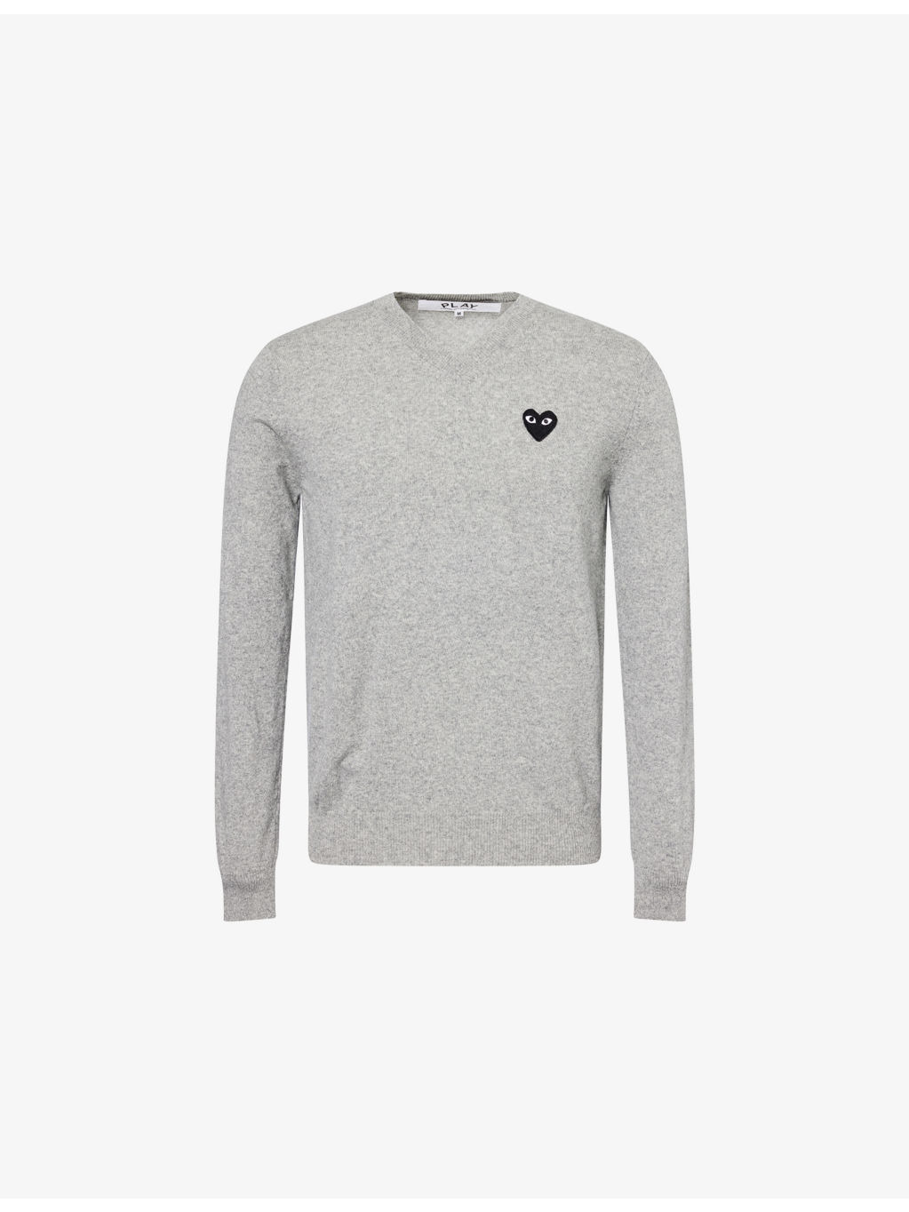 PRODUCT DETAILS - Comme des Garcons PLAY wool sweatshirt - 100% wool - Regular fit, V-neck, long sleeves, heart patch at front, ribbed trims - Dry clean - Model is 6ft 2in/1.88m and wears a size medium - Lightweight, slight stretch Ref: R04507726