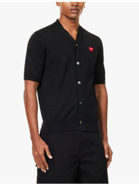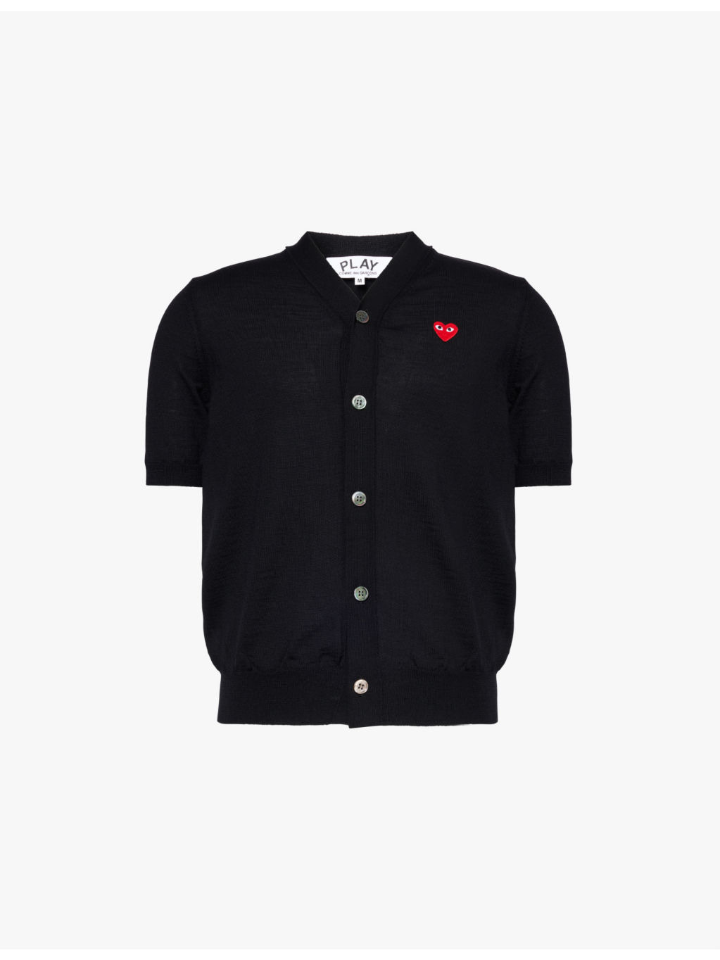 PRODUCT DETAILS - Comme des Garcons PLAY wool cardigan - 100% wool - Exposed button fastening at front - Regular fit, V neck, short sleeves, heart patch at front, all over fine-knit pattern, ribbed trims - Dry clean - Made in Japan - Size medium: length 26in / 66cm - Model is 6ft 2in/1.88m and wears a size medium - Lightweight, stretchy Ref: R04351660