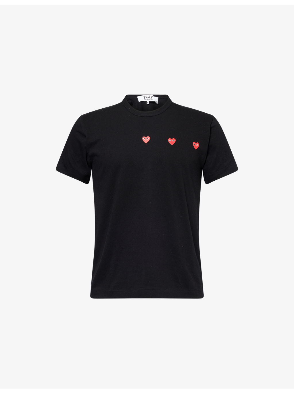 PRODUCT DETAILS - Comme des Garcons PLAY cotton t-shirt - 100% cotton - Crewneck, short sleeves, triple heart graphic-print at front - Machine wash mild - Made in Japan - Model is 6ft 2in/1.88m and wears a size medium - Lightweight, non-stretch Ref: R04470570