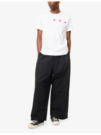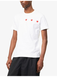 PRODUCT DETAILS - Comme des Garcons PLAY cotton t-shirt - 100% cotton - Crewneck, short sleeves, triple heart graphic-print at front - Machine wash mild - Made in Japan - Model is 6ft 2in/1.88m and wears a size medium - Lightweight, non-stretch Ref: R04470570