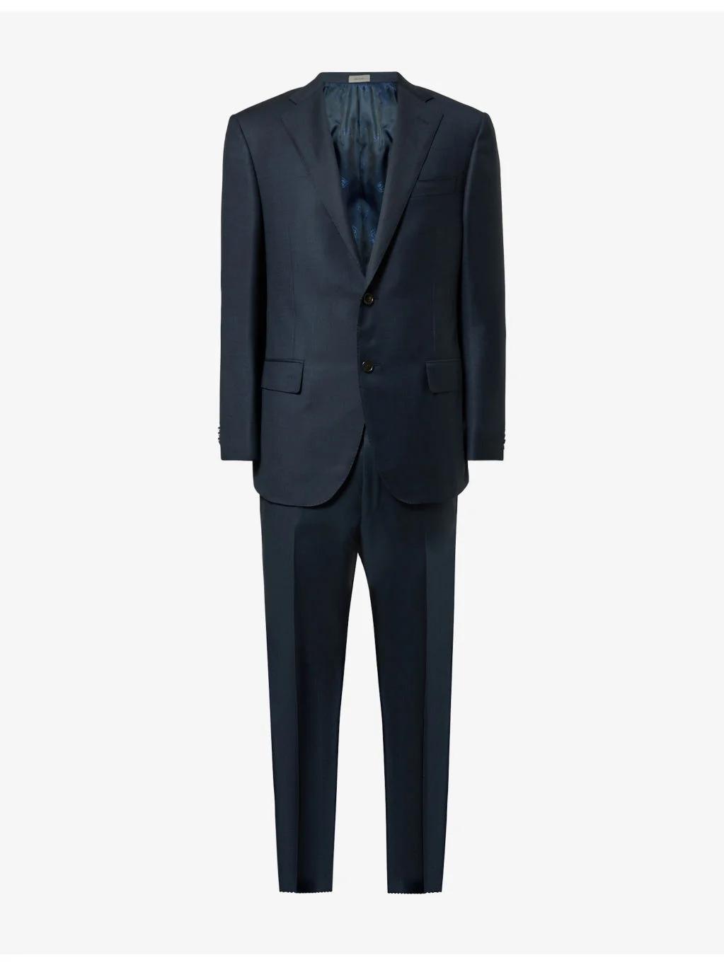 PRODUCT DETAILS - Corneliani wool suit - 100% wool - Jacket: regular fit, peak lapels, single-breasted, long sleeves, buttoned cuffs, welt pocket at chest, two flap pockets at front, welt pockets at interior, double vent, fully lined Trousers: tapered fit, mid-rise, straight leg, belt loops, two slip pockets at sides, two buttoned welt pockets at back, unaltered hem - Dry clean - Made in Italy - True to size - Jacket size UK 40: length 31in / 82cm, chest 41.5in / 105cm Trousers size UK 40: rise 10in / 25.4cm, inside leg (unaltered) 36.5in / 92.6cm, leg opening 15in / 48cm - Model is 6ft 2in/1.88m and wears a size UK 40 - Midweight, non-stretch Ref: R04560437