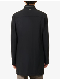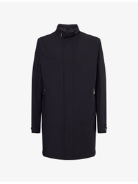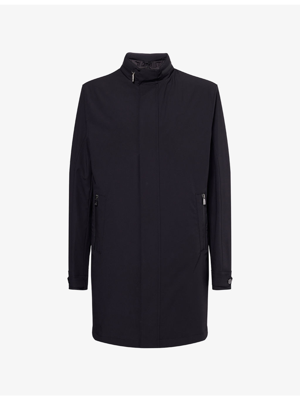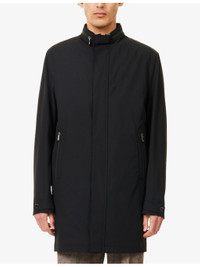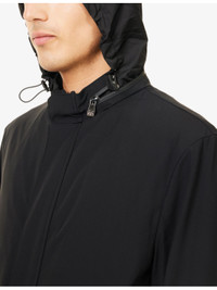 PRODUCT DETAILS - Corneliani waterproof jacket - 90% polyamide, 10% elastane; lining 100% polyester - Concealed button fastening - High neck, long sleeves with press stud fastening at cuff, concealed hood, two slanted zipped slip pockets at front, two internal slip pockets, detectable padded lining, fully lined, silver toned metal hardware - Dry clean - Made in Turkey - Size UK 40: length 36.6in / 93cm, chest 46in / 117cm - Model is 6ft 2in/1.88m and wears a size UK 40 - Midweight, non-stretch Ref: R04482902