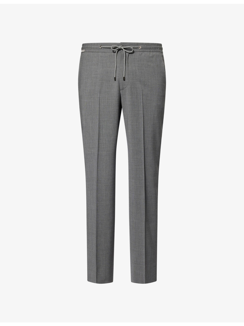 PRODUCT DETAILS - Corneliani stretch-wool trousers - 98% virgin wool, 2% elastane - Exposed button and concealed zip-fly fastening at front - Regular fit, mid-rise, elasticated drawstring waistband, slim leg, two side slip pockets, silver-toned hardware, pressed creases at leg, two rear welt buttoned pockets - Dry clean - Made in Romania - Size UK 32: rise 12in / 30.5cm, inside leg 30in / 76cm, leg opening 14in / 35cm - Model is 6ft 2in/1.88m and wears a size UK 32 - Lightweight, non-stretch Ref: R04482906