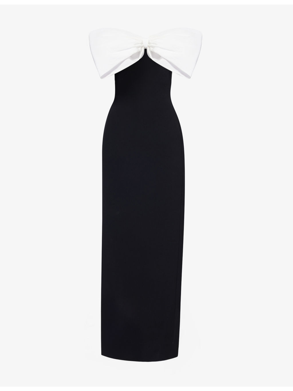 PRODUCT DETAILS - David Koma woven maxi dress - 50% viscose, 47% acetate, 3% elastane - Zip fastening - Strapless, bone bodice, large bow at front, split hem at back, fully lined - Dry clean only - True to size - Size 8: length 54in / 137cm - Model is 5ft 10in/1.78m and wears a size UK 8 - Midweight, non-stretch Ref: R04516676