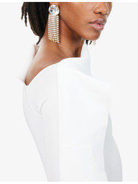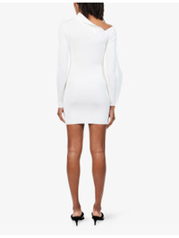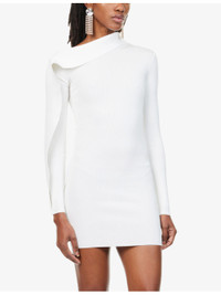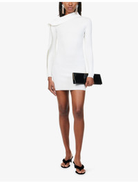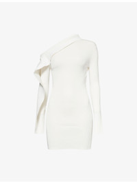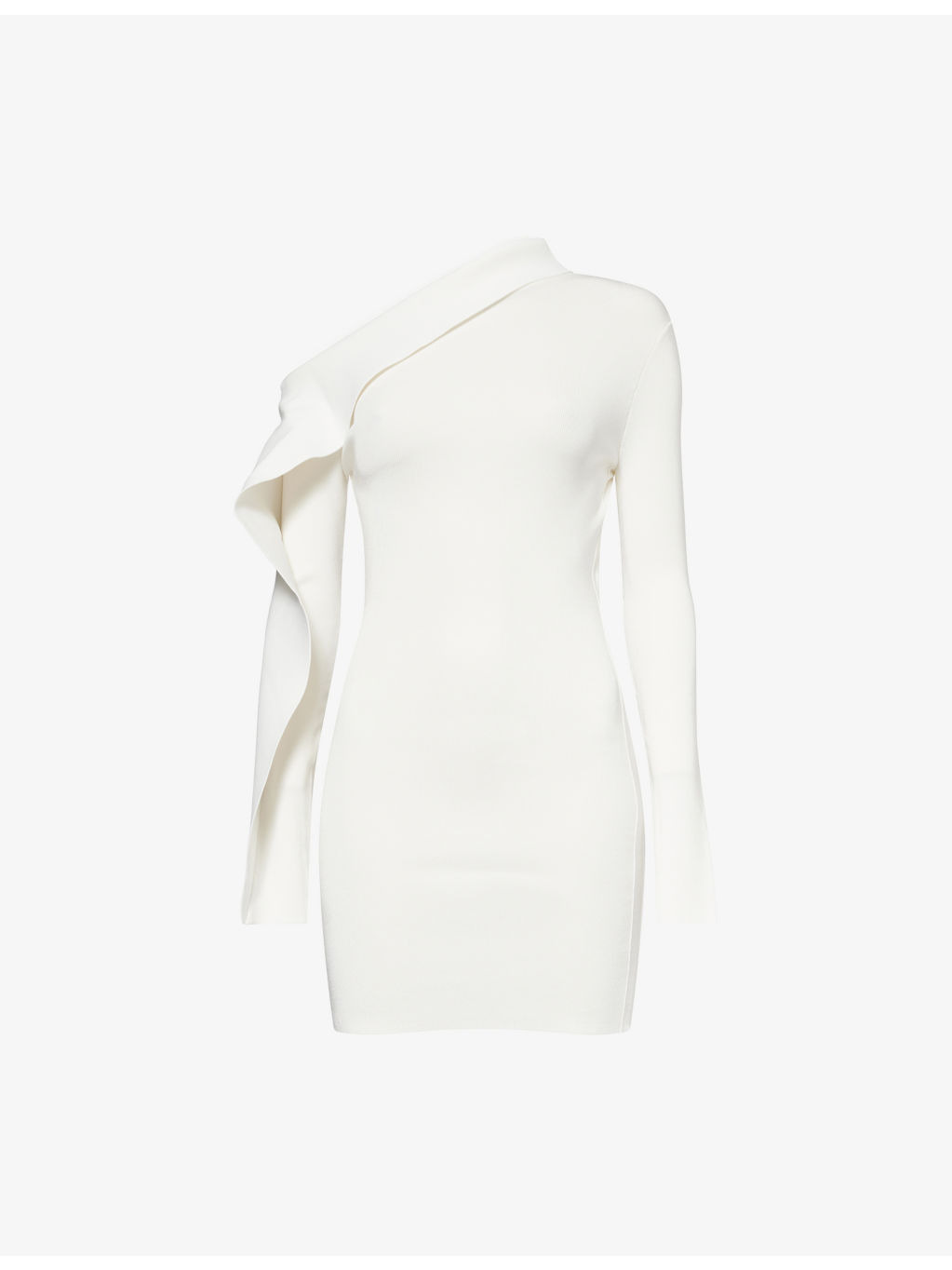 PRODUCT DETAILS - David Koma knitted mini dress - 89% viscose, 8% nylon, 2% polyester, 1% elastane - Slim fit, asymmetric neckline, one off-shoulder, long sleeves, drape at sleeve, all-over knitted and ribbed - Specialist dry clean only - True to size - Size small: length 31in / 79cm - Model is 5ft 10in/1.78m and wears a size small - Midweight, stretchy Ref: R04516680