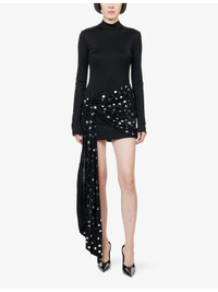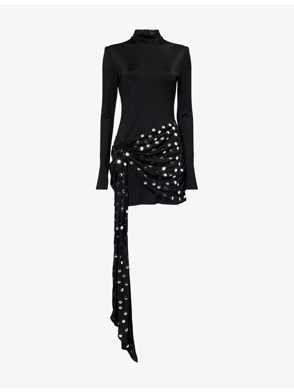 PRODUCT DETAILS - David Koma stretch-jersey mini dress - 100% viscose - Zip fastening - Close fitting, high neck, long sleeves, silver tone dot embellishment, wrap detail, short length - Dry clean - True to size - Size 8: length 35in / 88.9cm - Model is 5ft 10in/1.78m and wears a size UK 8 - Midweight, stretchy Ref: R04516677