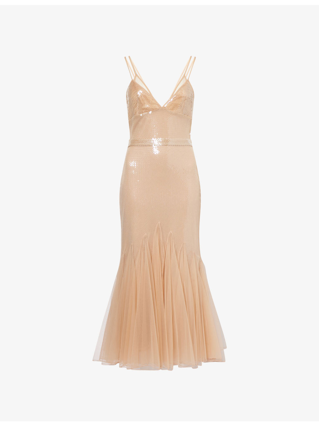 PRODUCT DETAILS - David Koma woven midi dress - 90% polyester, 10% polyamide; contrast 100% polyamide; lining 95% nylon, 5% elastane - Concealed zip fastening at back - Regular fit, V-neck, shoulder straps, belt, sequin embellished top, all-over mesh texture, multi-layered, fully lined, ruffled hem - Dry clean - True to size - Size UK 8: length 49in / 125cm - Model is 5ft 10in/1.78m and wears a size UK 8 - Lightweight, slight stretch Ref: R04463079