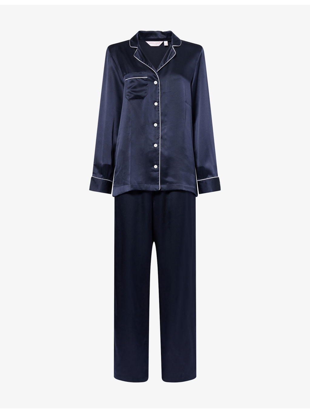 PRODUCT DETAILS - Derek Rose silk pyjama set - 100% silk - Exposed button fastening at front - Top: relaxed fit, notch collar, long sleeves, patch pocket at front, all-over satin texture, contrast piping - Bottoms: relaxed fit, high-rise, straight leg, drawstring elasticated waistband, all-over satin texture - Hand wash cold - True to size - Model is 5ft 10in/1.78m and wears a size small - Lightweight, stretchy Ref: R04540286