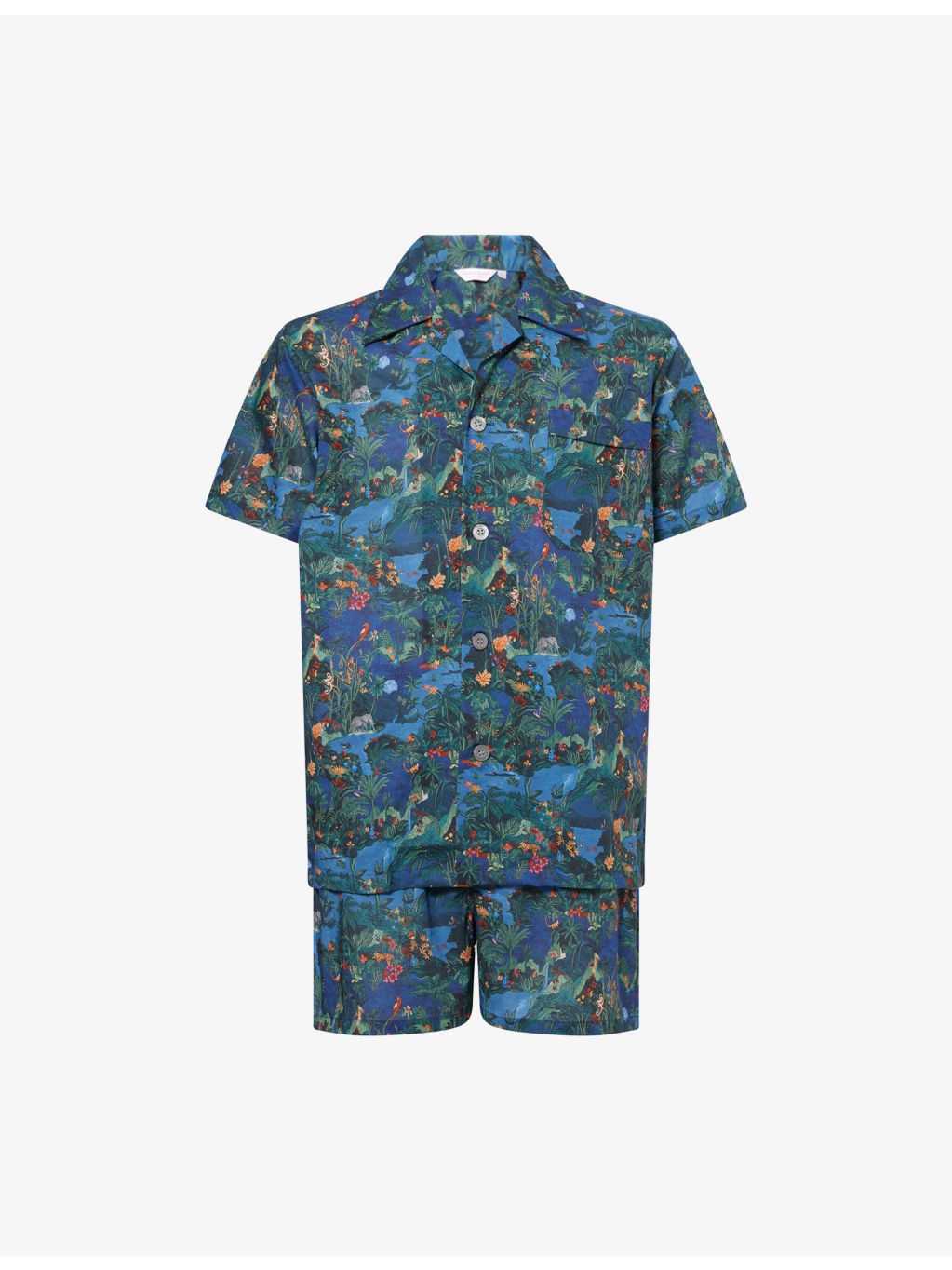 PRODUCT DETAILS - Derek Rose cotton-poplin pyjama set - 100% cotton - Exposed button fastening at front - Top: regular fit, camp collar, short sleeves, patch pocket at front, all-over graphic print - Shorts: regular fit, mid-rise, elasticated waistband, all-over graphic print - Machine wash at 30°C - Model is 6ft 2in/1.88m and wears a size UK 38 - Lightweight, stretchy Ref: R04463475