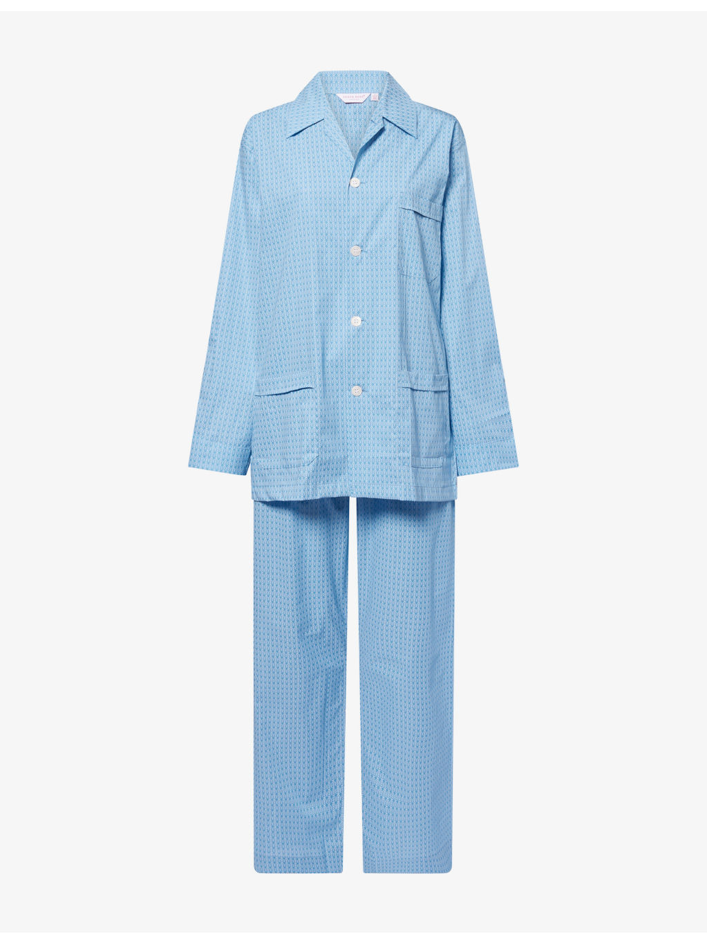 PRODUCT DETAILS - Derek Rose cotton-poplin pyjama set - 100% cotton - Exposed button fastening at front - Top: relaxed fit, notch lapels, long sleeves, patch pocket at front, pearlescent buttons, all-over graphic pattern pattern, piping trims - Trousers: relaxed fit, mid-rise, straight leg, elasticated drawstring waistband, slip pockets at sides, all-over graphic pattern - Machine wash at 30°C - Model is 6ft 2in/1.88m and wears a size medium - Lightweight, non-stretch Ref: R04463478