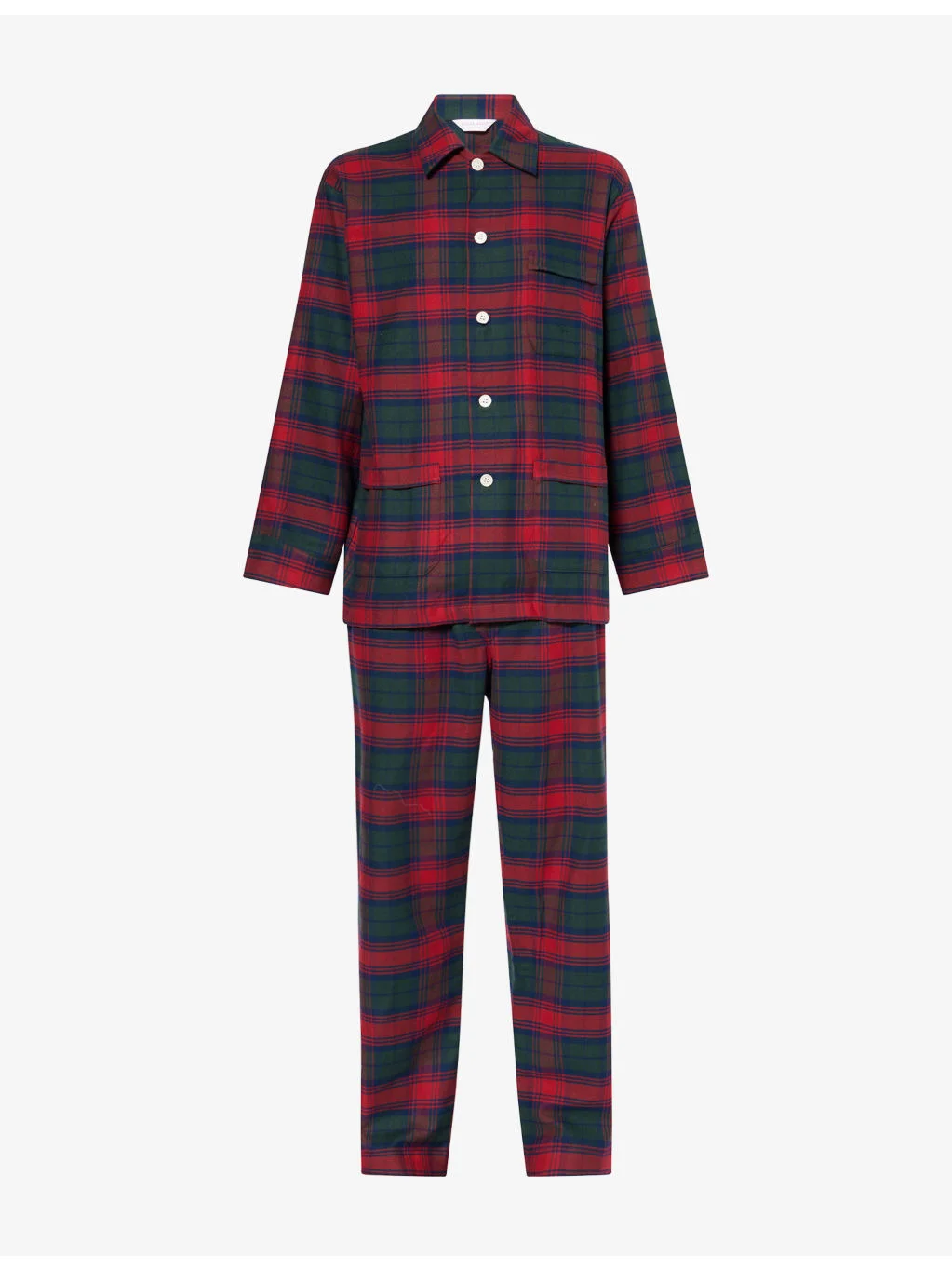 PRODUCT DETAILS - Derek Rose cotton pyjamas set - 100% cotton - Button fastening - Top: exposed button fastenings at front, relaxed fit, pointed camp collar, long sleeves, dropped shoulders, all-over checked print, patch pocket at chest - Bottoms: relaxed fit, mid-rise, elasticated drawstring waistband, straight leg, all-over check print - Machine wash at 30°C - Model is 6ft 2in/1.88m and wears a size medium - Lightweight, non-stretch Ref: R04547225
