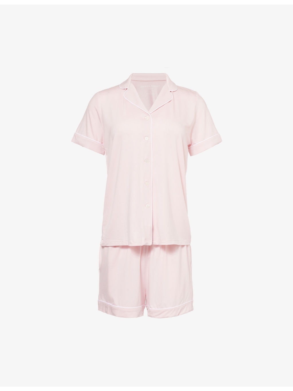 PRODUCT DETAILS - Derek Rose stretch-jersey pyjama set - 95% modal, 5% elastane - Exposed button fastenings at front - Top: Relaxed fit, camp collar, short sleeves, pearlescent buttons, contrast piping - Bottoms: Relaxed fit, mid-rise, straight leg, drawstring elasticated waistband, slip pockets at sides, contrast piping - Machine wash cold - True to size - Model is 5ft 10in/1.78m and wears a size small - Midweight, slight stretch Ref: R04341583