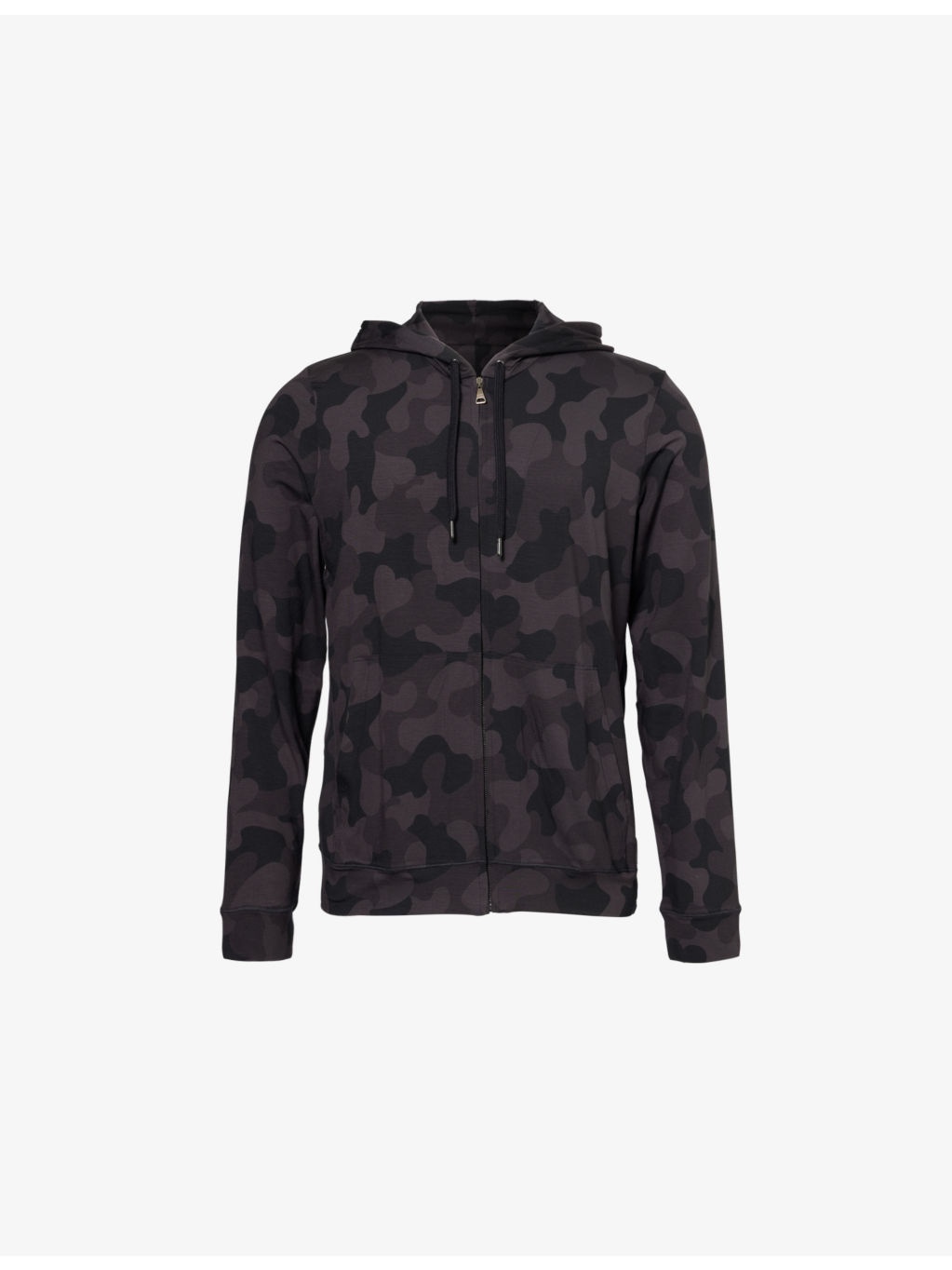 PRODUCT DETAILS - Derek Rose modal-blend hoody - 95% modal, 5% elastane - Exposed zip fastening at front - Regular fit, drawstring hood, long sleeves, two slip pockets at front, all over camouflage print, ribbed trims - Machine wash at 30°C - Model is 6ft 2in/1.88m and wears a size medium - Midweight, slight stretch Ref: R04366449