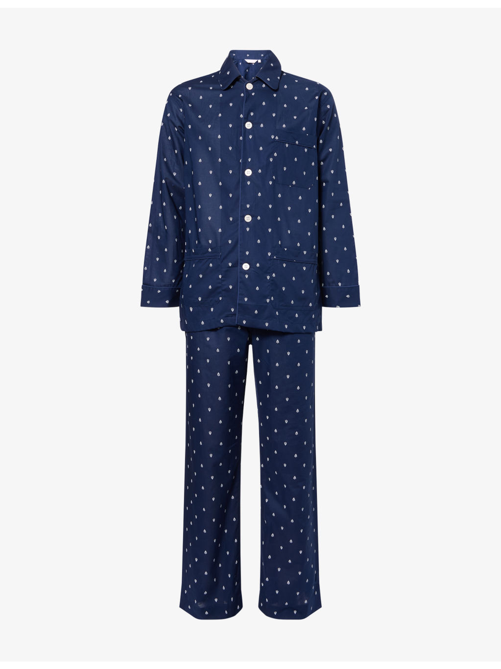 PRODUCT DETAILS - Derek Rose cotton pyjamas - 100% cotton - Button fastening - Shirt: relaxed fit, spread collar, long sleeves, patch pocket at front, all-over nautical knot motif print, contrast piping trim - Trousers: elasticated waist, button front, straight leg, all-over nautical knot motif print - Machine wash mild - Model is 6ft 2in/1.88m and wears a size medium - Lightweight, non-stretch Ref: R04463472