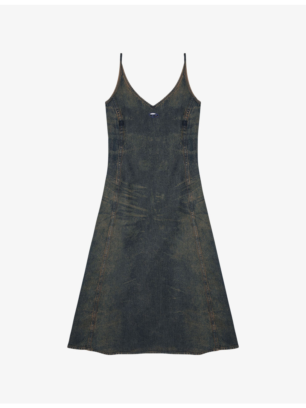 PRODUCT DETAILS - Diesel lyocell midi dress - 100% lyocell - Concealed zip fastening at side - Slim fit, V-neck, adjustable shoulder straps, embroidered cut-out branding at neckline, all-over dirt-effect denim, whiskering at front, midi length - Machine wash at 30°C - True to size - Model is 5ft 9in/1.75m and wears a size small - Lightweight, non-stretch Ref: R04479151
