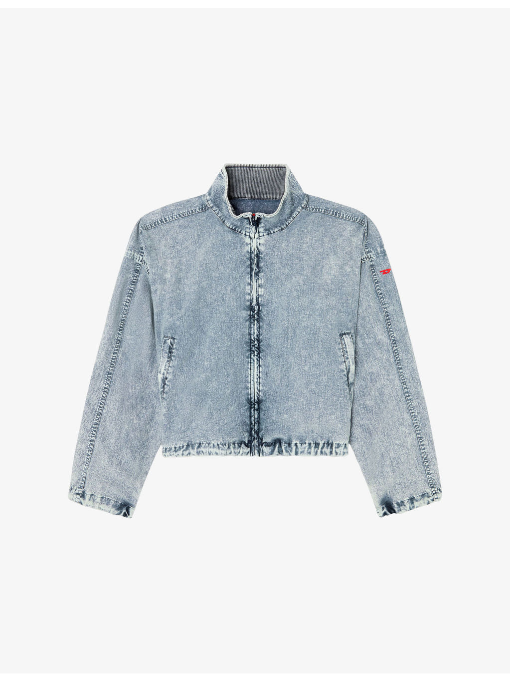 PRODUCT DETAILS - Diesel woven jacket - 100% polyamide - Exposed zip fastening at front - Oversized fit, high neck, long sleeves, dropped shoulders, all-over acid-washed denim effect, two vertical welt pockets at front, drawstring cuffs and hem, cropped hem, lined - Machine wash at 30°C - True to size - Model is 5ft 9in/1.75m and wears a size UK 8 - Lightweight, non-stretch Ref: R04479234