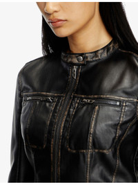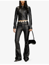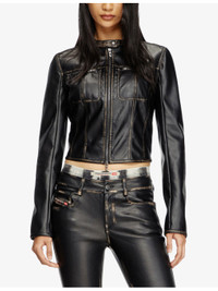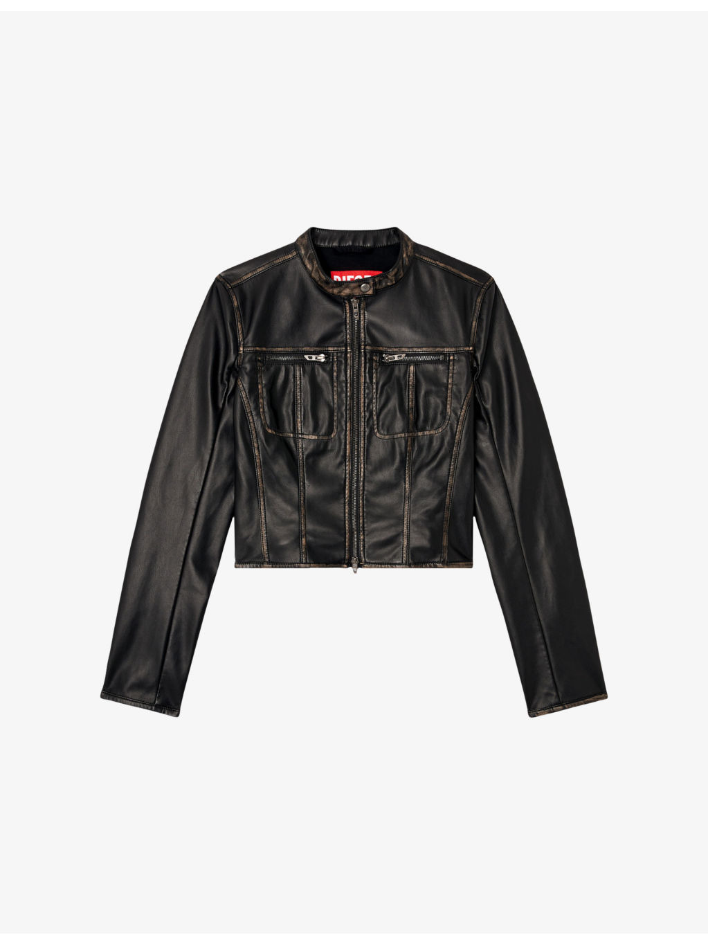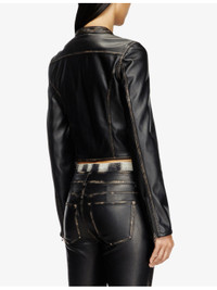 PRODUCT DETAILS - Diesel faux-leather cropped jacket - 100% polyester; lining 100% polyurethane - Snap-fastening collar, regular-fit, long-sleeves, two slip-pockets at front with logo branded zip fastening, top-stitch, all-over distressed detailing, fully lined - Hand wash - True to size - Model is 5ft 10in/1.78m and wears a size UK 8 - Midweight, non-stretch Ref: R04410357