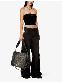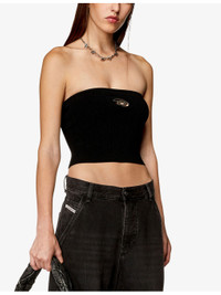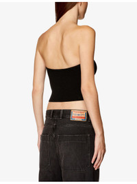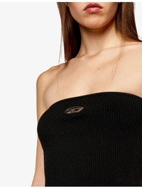 PRODUCT DETAILS - Diesel knitted top - 83% viscose, 17% polyester - Slips on - Slim fit, strapless design, sleeveless, logo-plaque at the front, all-over ribbed finish - Hand wash - True to size - Model is 5ft 9in/1.75m and wears a size UK 8 - Midweight, non-stretch Ref: R04295390