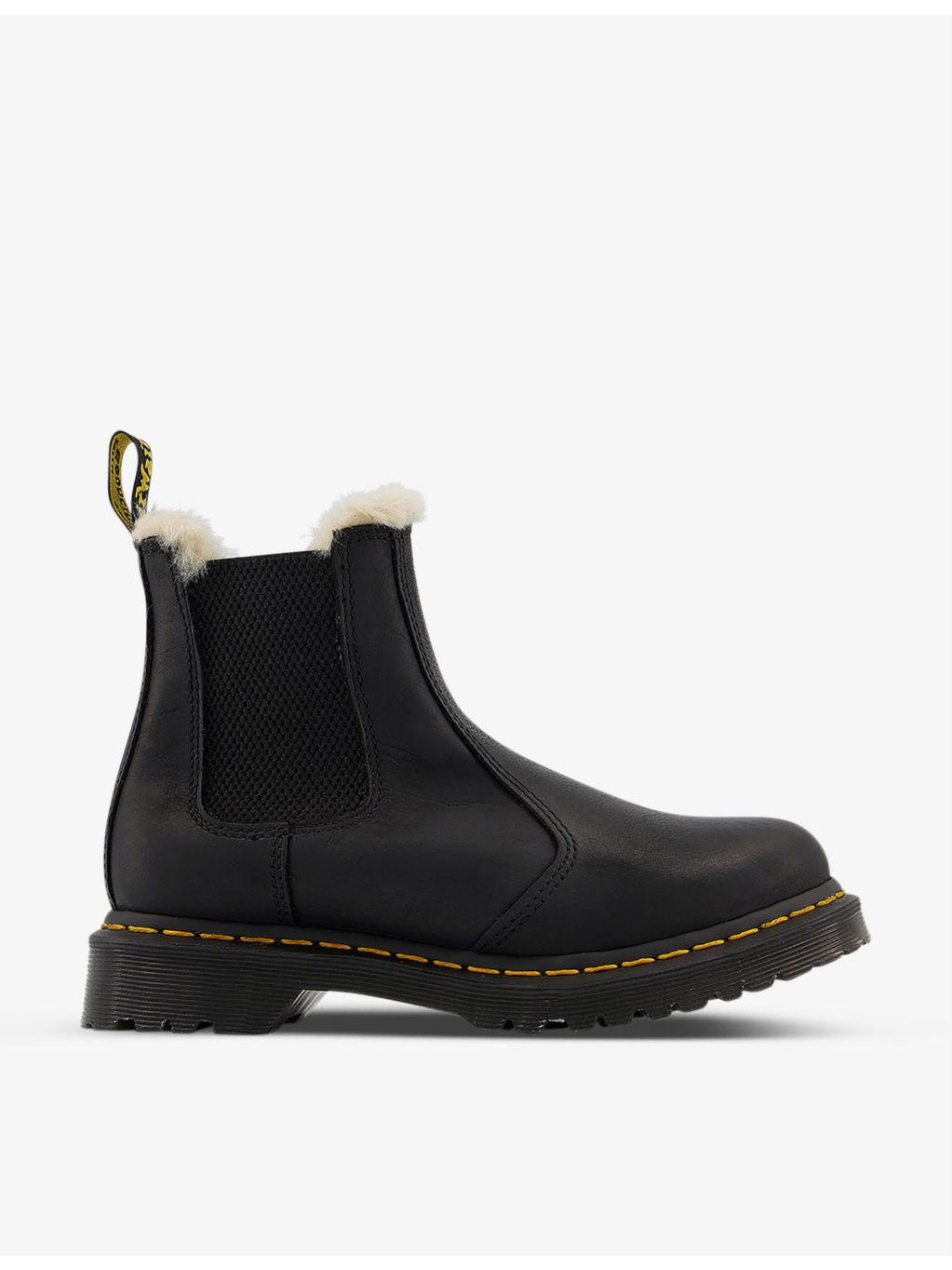 PRODUCT DETAILS - Dr. Martens leather boots - 70% Leather, 30% Elastane - Slips on - Round toe, faux-fur lining, elasticated side gussets, yellow welt stitch, grooved midsole, branded pull-tab to the back, air-cushioned sole - Specialist leather clean - Upper: 70% Leather, 30% Elastane - Lining: 100% Textile - Sole: 100% PVC Ref: R03708892