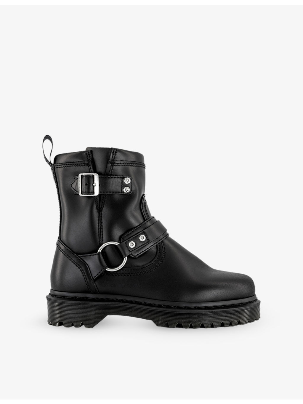 PRODUCT DETAILS - Dr. Martens leather ankle boots - 100% leather - Closed round toe, ankle length, branded pull-loop to back, buckled strap at shaft, strap and harness to front, silver-toned hardware - Specialist leather clean - Upper: 100% leather - Lining: 100% leather; 100% fabric - Sole: 100% PVC Ref: R04520996