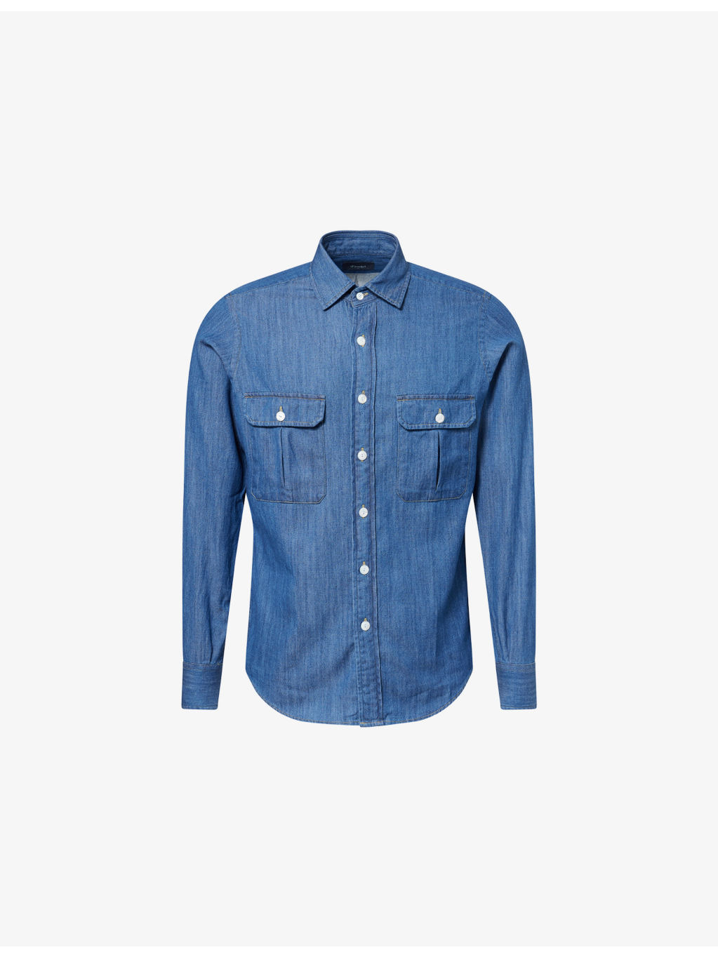 PRODUCT DETAILS - Drake's denim shirt - 100% cotton - Button fastening - Regular fit, collar, long sleeves, buttoned cuffs, pockets at chest, mid-wash, curved hem - Machine wash cold - Model is 6ft 2in/1.88m and wears a size medium - Lightweight, non-stretch Ref: R04520814
