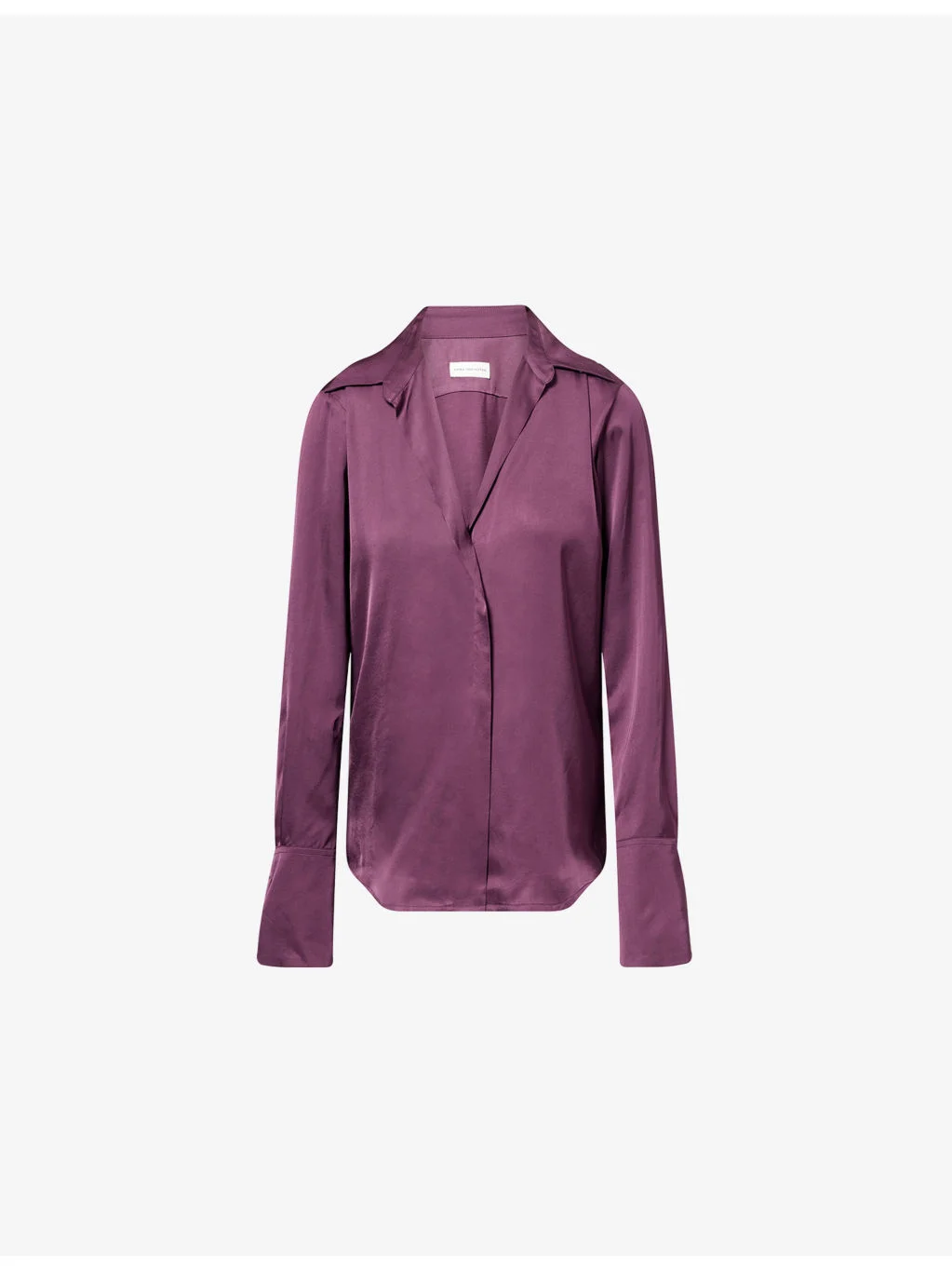 PRODUCT DETAILS - Dries Van Noten satin shirt - 100% viscose - Button fastening - Relaxed fit, open collar, v-neck, long sleeves, buttoned cuffs, curved hem - Dry clean - Made in Tunisia - True to size - Model is 5ft 10in/1.78m and wears a size UK 8 - Lightweight, non-stretch Ref: R04602581