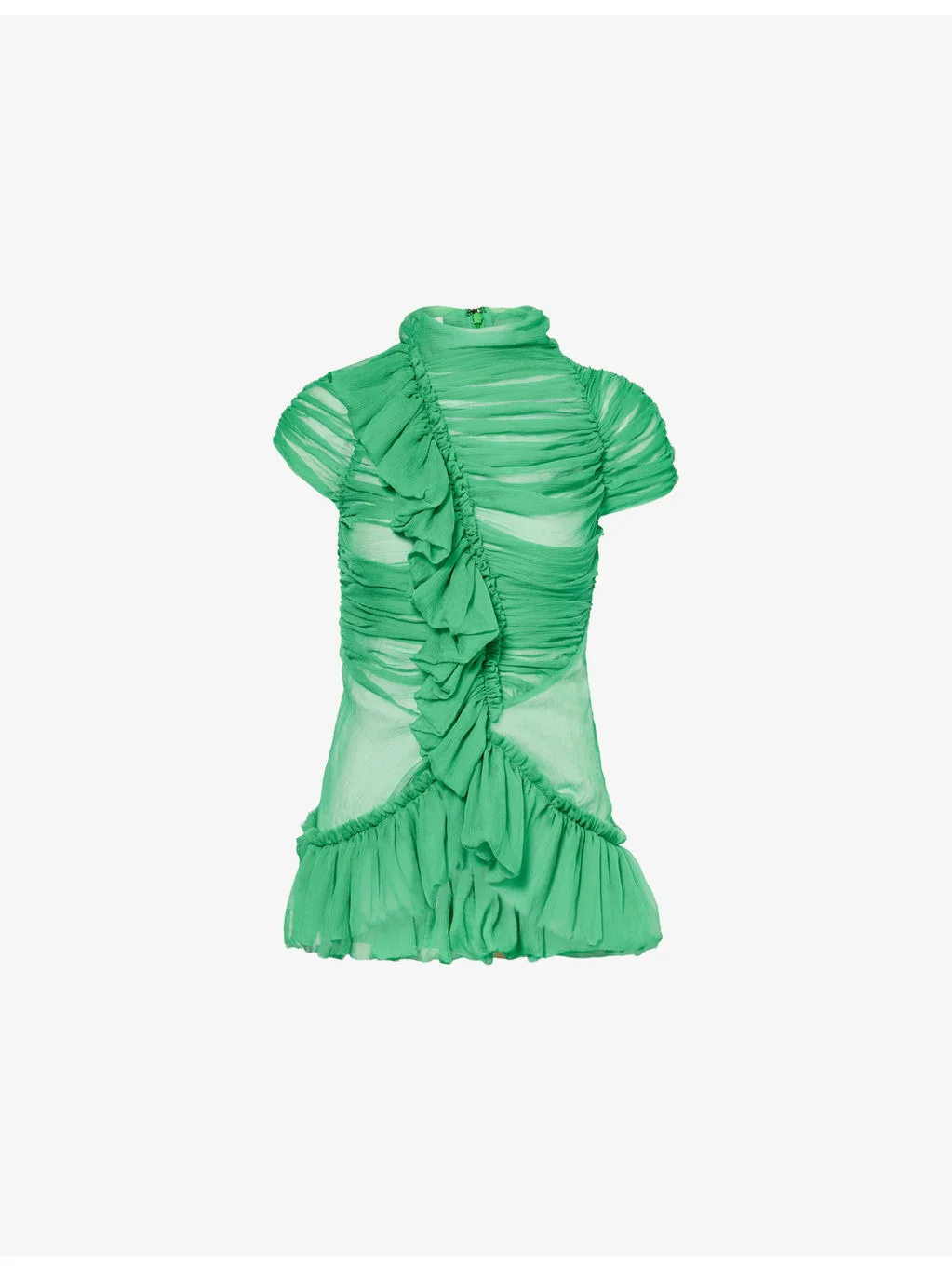 PRODUCT DETAILS - Dries Van Noten silk shirt - 100% silk - Concealed zip fastening at back - Regular fit, high-neck, sleeveless, draped design, frilled trims, asymmetric hem - Dry clean - Made in Poland - True to size - Size UK 8: length 28in / 71cm - Model is 5ft 10in/1.78m and wears a size UK 8 - Lightweight, non-stretch Ref: R04602624