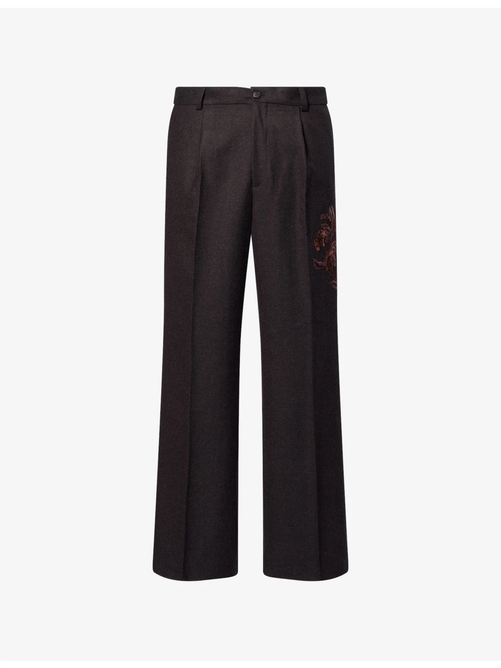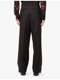PRODUCT DETAILS - Dries Van Noten wool trousers - 100% wool - Button and zip-fly fastening - Regular fit, high-rise, straight leg, belt loops, pressed creases at front and back, side-slip pockets, welt pockets at back, embroidered detailing at leg - Dry clean - Made in India - Size 32: rise 12.2in / 31cm, inside leg 33in / 84cm, leg opening 20.8in / 53cm - Model is 6ft 2in/1.88m and wears a size UK 32 - Lightweight, non-stretch Ref: R04531270