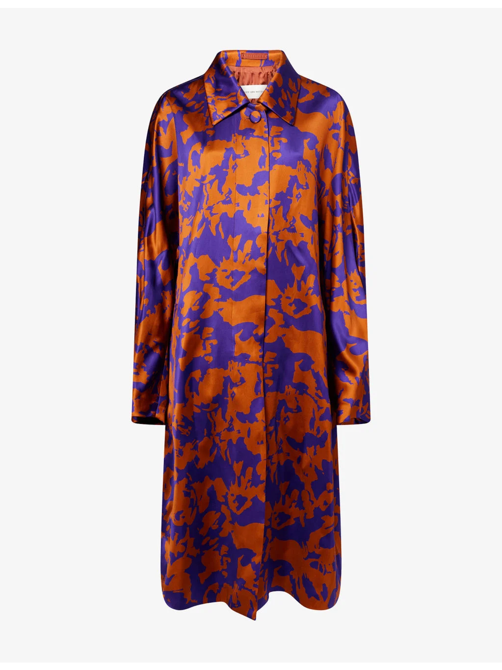 PRODUCT DETAILS - Dries Van Noten woven coat - 100% viscose; lining 100% viscose - Concealed button fastenings at front - Relaxed fit, spread-collar, long sleeves, two welt pockets at front, all-over abstract print, all-over satin texture, fully lined - Dry clean - Made in Romania - True to size - Size UK 8: length 45in / 115cm - Model is 5ft 10in/1.78m and wears a size UK 8 - Midweight, non-stretch Ref: R04557772