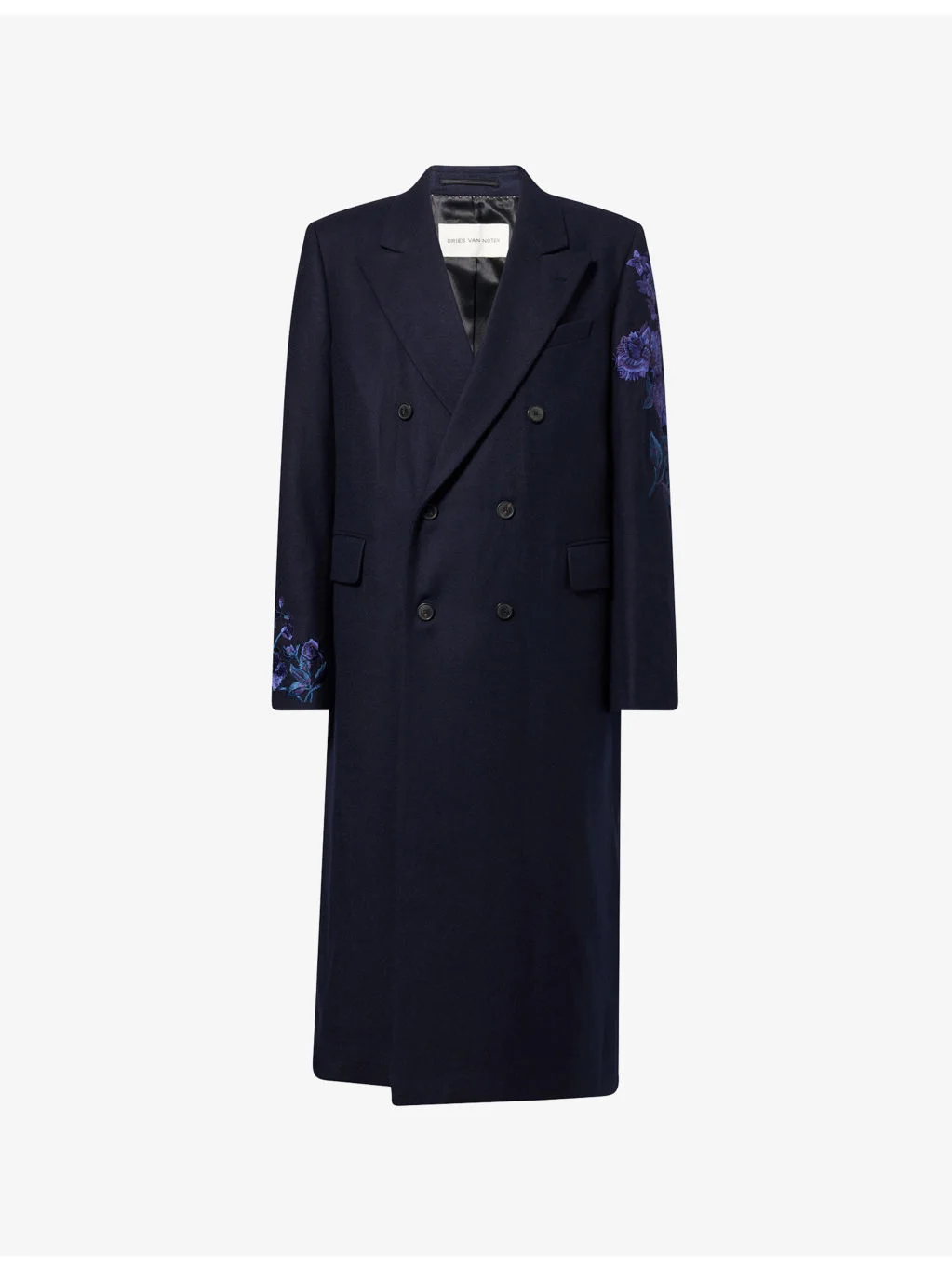 PRODUCT DETAILS - Dries Van Noten wool coat - 100% wool - Button fastening at front - Peak lapel, double-breasted, one welt pocket at chest, two flap pockets at front, embroidered detailing, single vent at back, lined - Dry clean - Made in India - Size UK 40: length 51.1in / 130cm, chest 47.2in / 120cm - Model is 6ft 2in/1.88m and wears a size UK 40 Ref: R04531264
