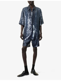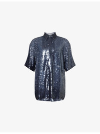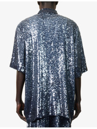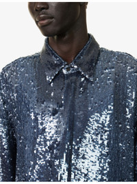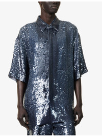 PRODUCT DETAILS - Dries Van Noten woven shirt - 100% viscose - Concealed button fastenings at front - Spread collar - Closed cuffs - Relaxed fit, collar, short sleeves, all-over sequin embellishment - Dry clean - Made in India - Size medium: length 30in / 77cm, chest 44in / 112cm - Model is 6ft 2in/1.88m and wears a size medium - Midweight, stretchy Ref: R04457279
